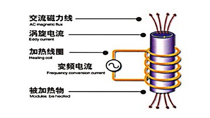 An SCR frequency converter supplies AC at the required frequency; a helical inductor creates an alternating magnetic field; eddy currents heat the billet volumetrically.