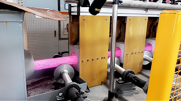 Heated bars pass through a spray-quench zone for rapid cooling, forming a hardened case and increasing strength and wear resistance.